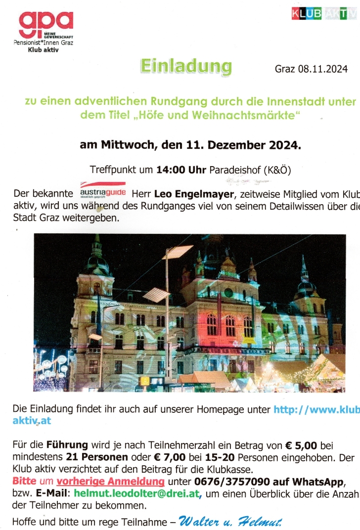 Einladung Stadtführung 11.12.2024 - GPA-djp Graz PensionistInnen KLUB AKTIV