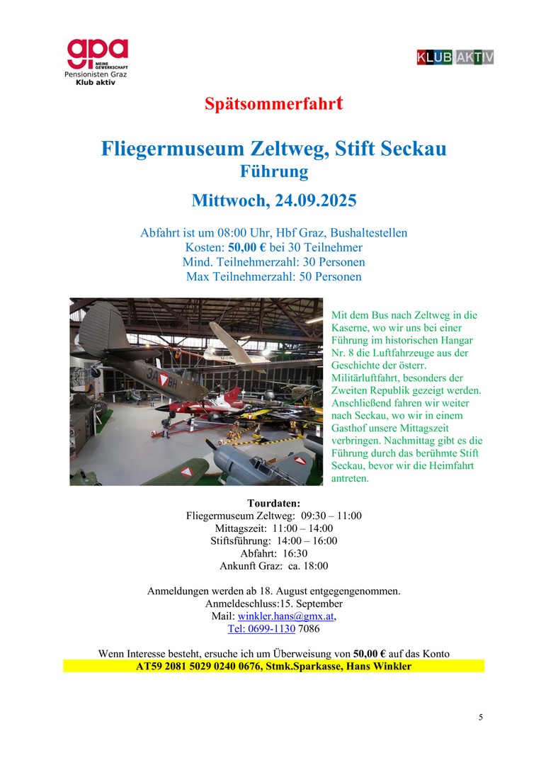 Heeresluftfahrtmuseum, Stift Seckau - GPA-djp Graz PensionistInnen KLUB AKTIV
